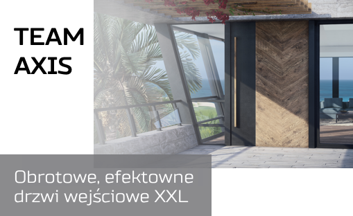 Drzwi wejściowe Team AXIS to niezwykle efektowne połączenie aluminium z innymi materiałami. Te obrotowe drzwi mogą mieć do 4 m wysokości! Nawet w rozmiarze XXL bez problemu otwiera się je i zamyka, ponieważ drzwi Team AXIS są wyposażone w opatentowane zawiasy firmy Frits Jurgens. Umożliwiają one przeniesienie ciężaru skrzydła do 500 kg, co jest ewenementem na rynku stolarki! Dodatkowo mają wbudowany samozamykacz, umożliwiający zatrzymanie skrzydła w pozycji otwartej na 90 stopni.